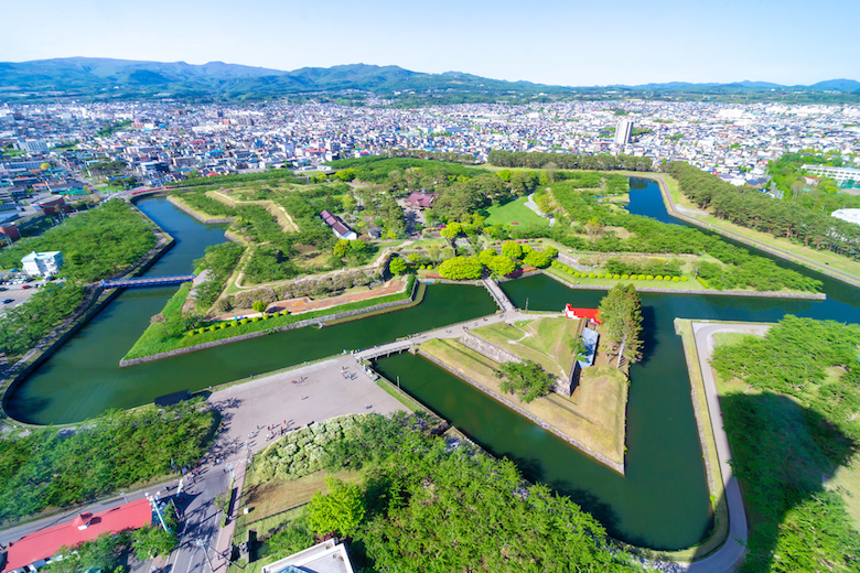 星型五角形の形が特徴的な五稜郭公園。1864年に竣工した日本初の西洋式城塞で、1868年〜1869年の函館戦争の際には、土方歳三ら旧幕府軍の拠点にもなりました。