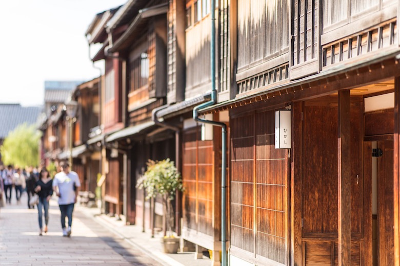 江戸時代に生まれ、今もなお金沢文化の代表として親しまれている茶屋街。木造格子窓の建物に石畳、かつては芸妓遊びなどで栄えた歓楽街でした。