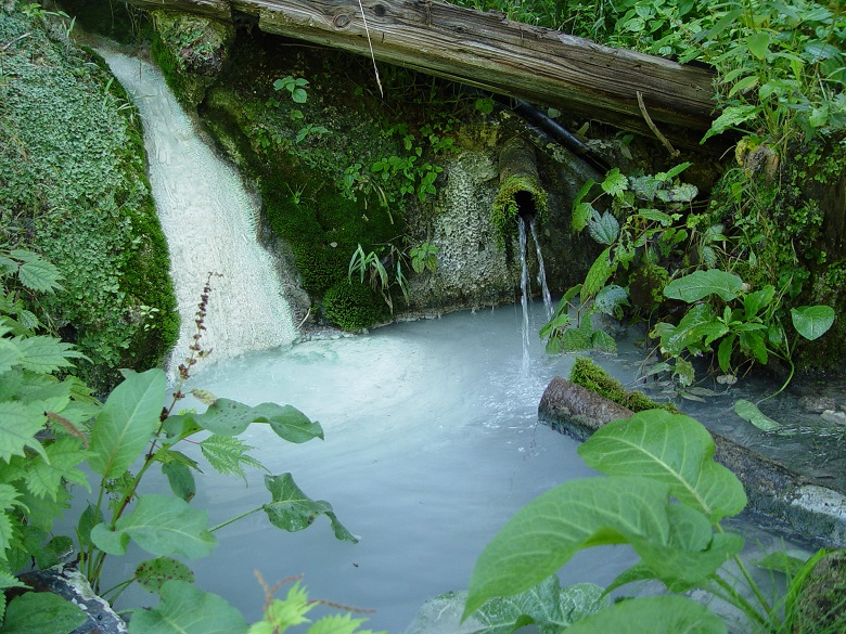 湯量は豊富で、単純硫化水素の源泉は湯口では無色透明ですが、空気に触れると、温泉に溶けこんでいる炭酸ガスが発泡し、炭酸カルシウムと硫黄が反応して白濁になります。